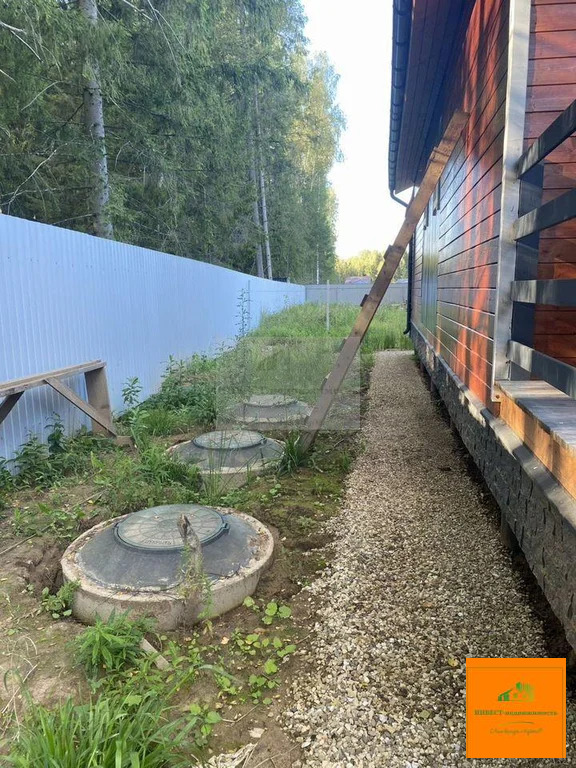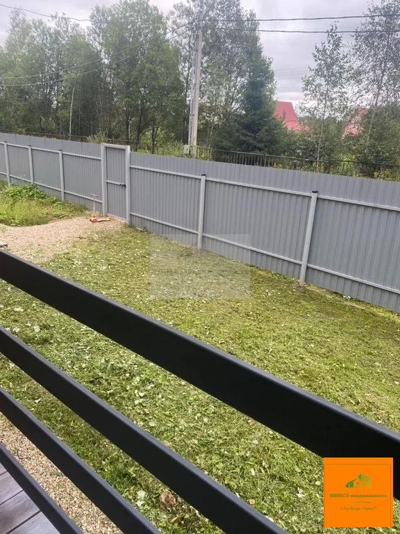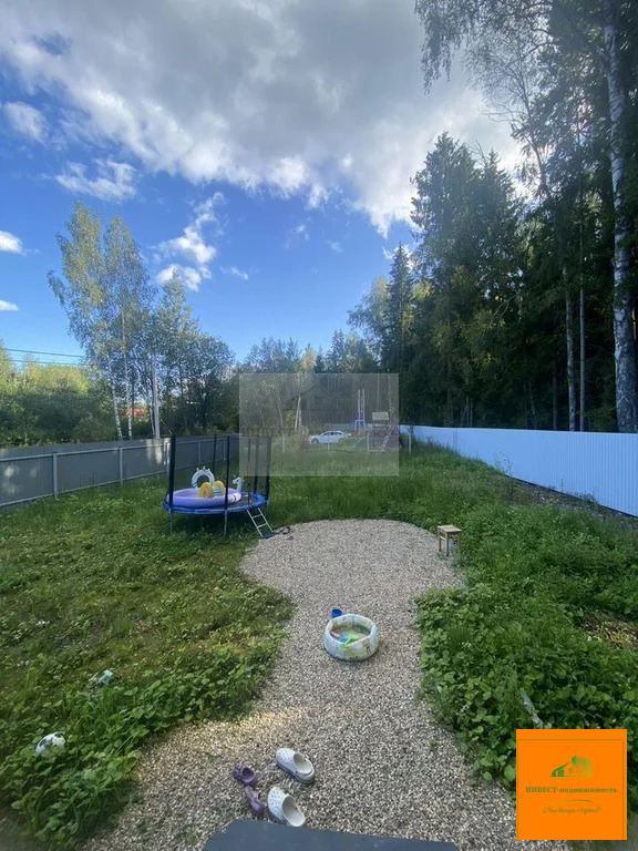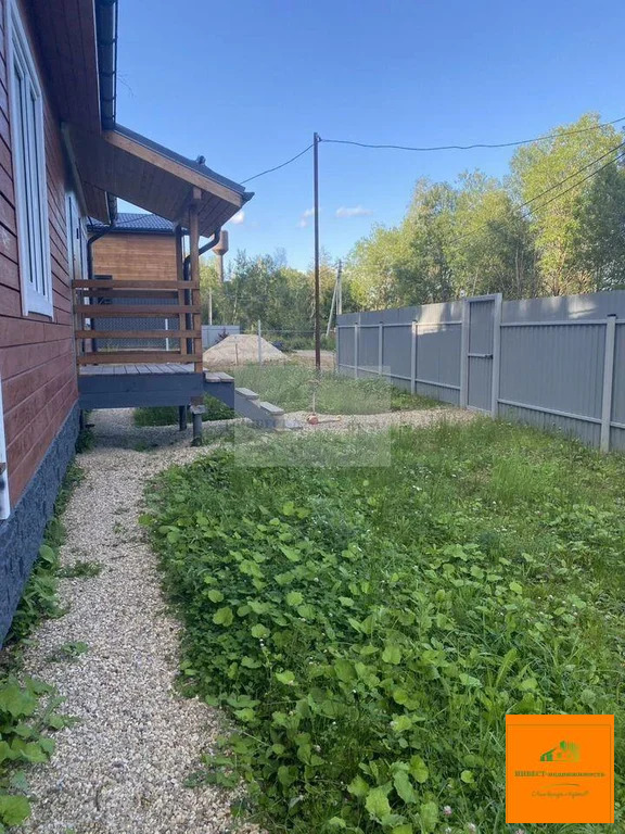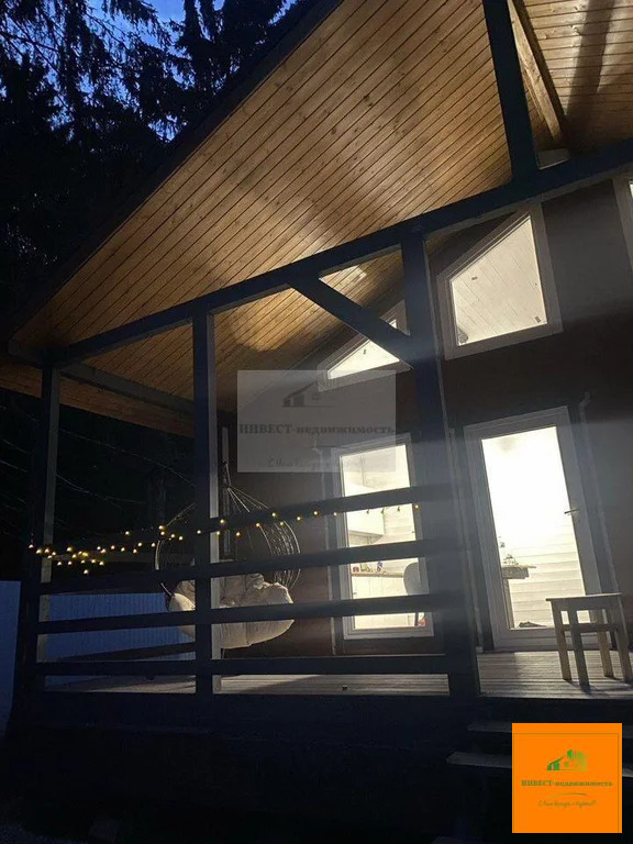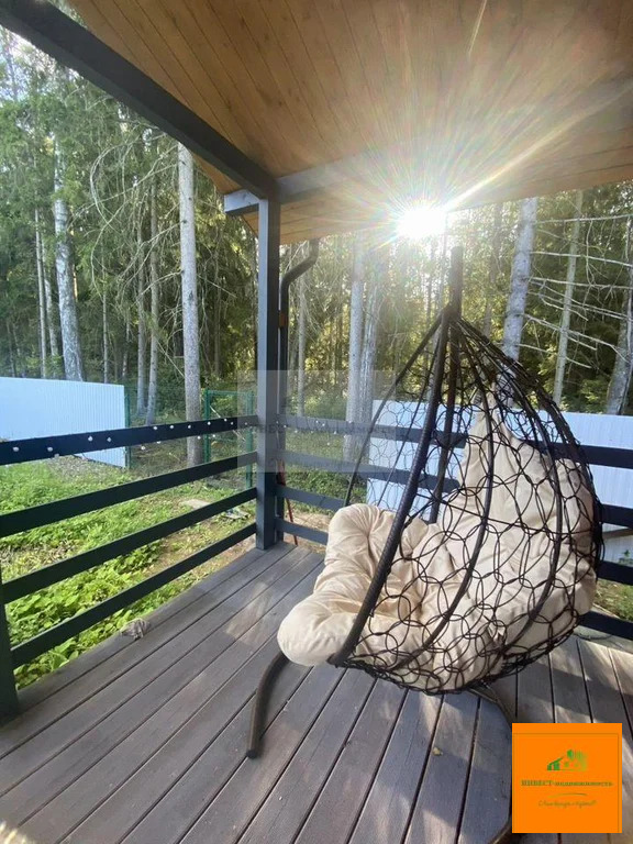 На террасе вас будет ждать подвесная качель — отличное место для отдыха и релаксации. Вокруг дома выложена отмостка, а на участке — дорожки. На участке растут ёлочки, а сам он огорожен забором.