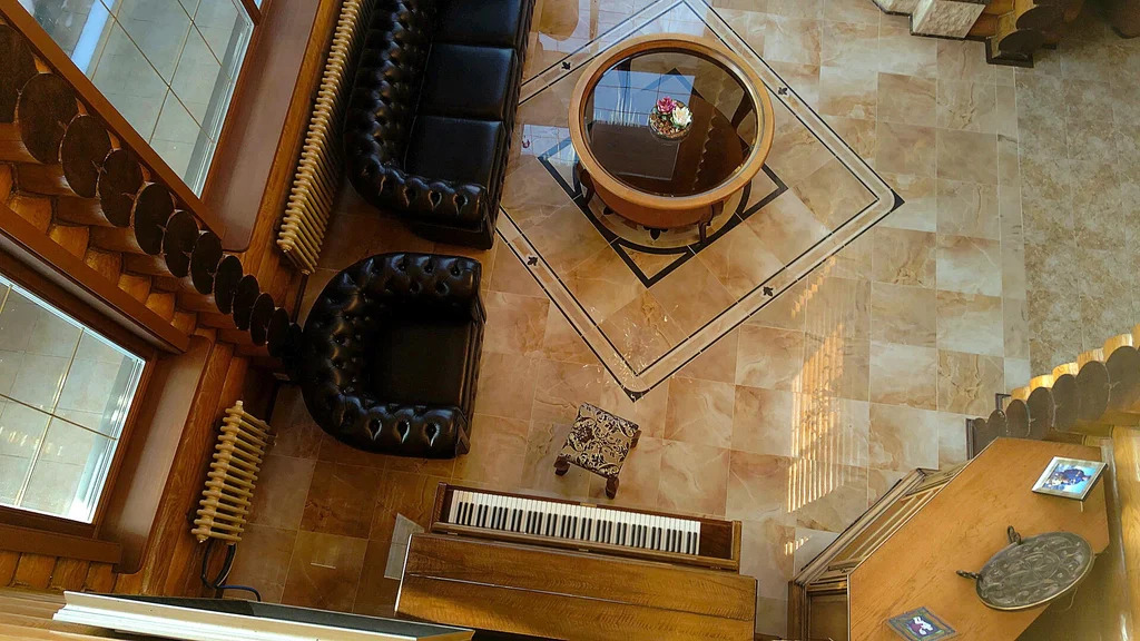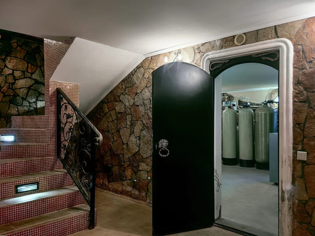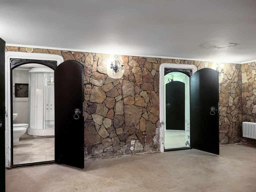 Цоколь: винный погреб, барная комната, кинозал (отделанный кожей и деревом), бильярдная, спортивный зал, холодильные шкафы, санузел, бойлерная, электромонтажная.
